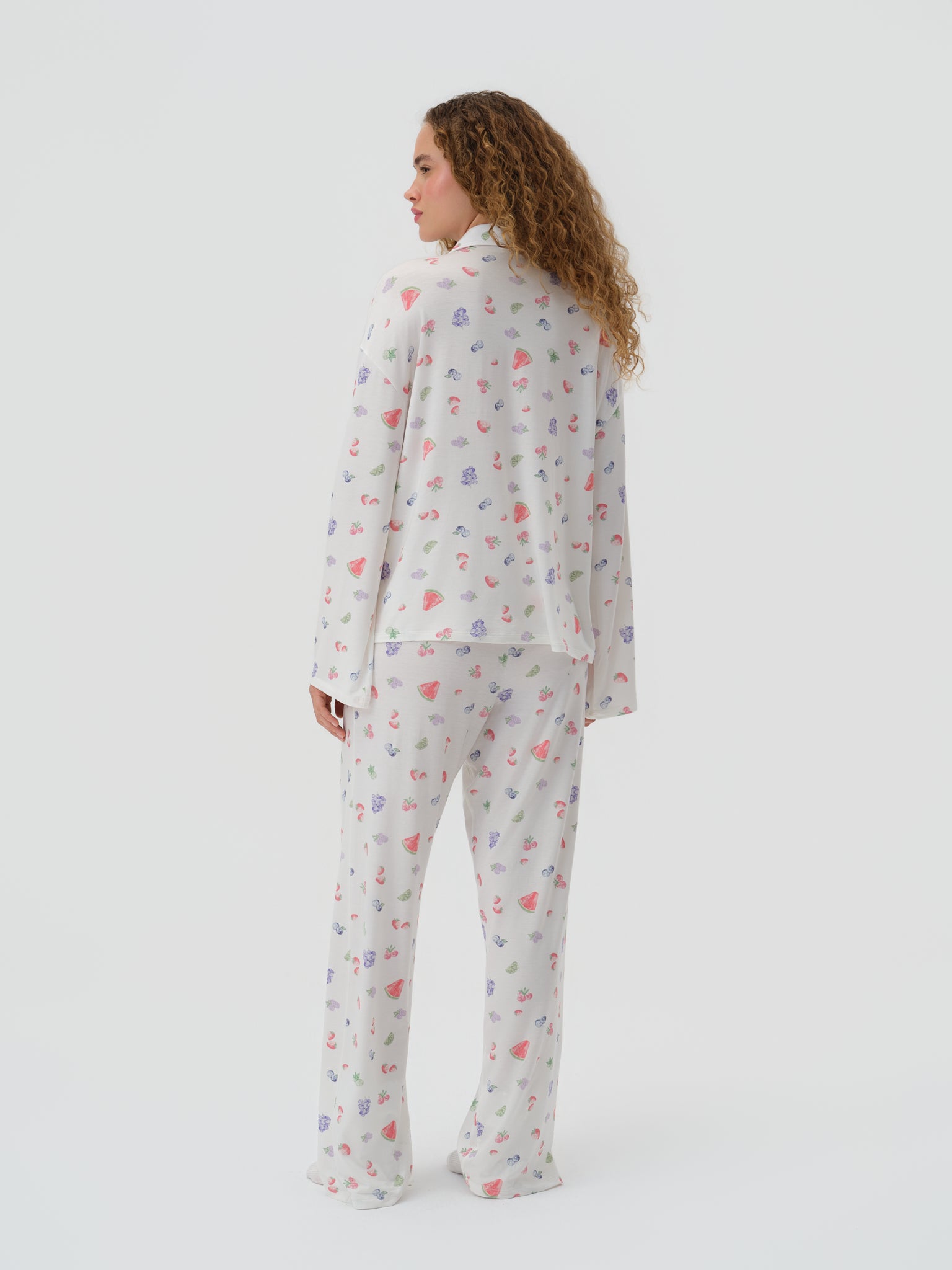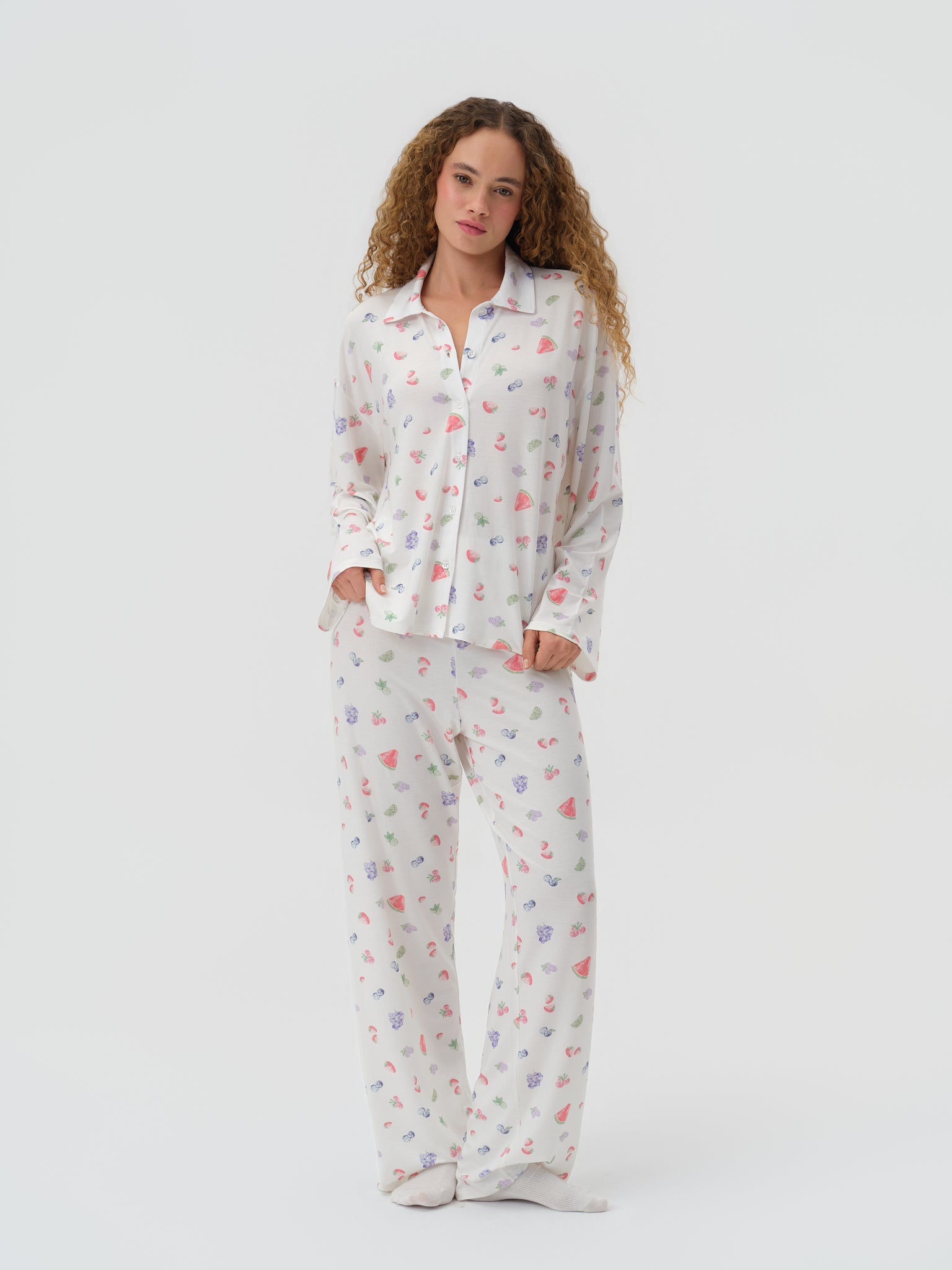 Meyve desenli kumaşı ve rahat kesimiyle konforlu bir kullanım sunar.
