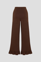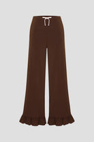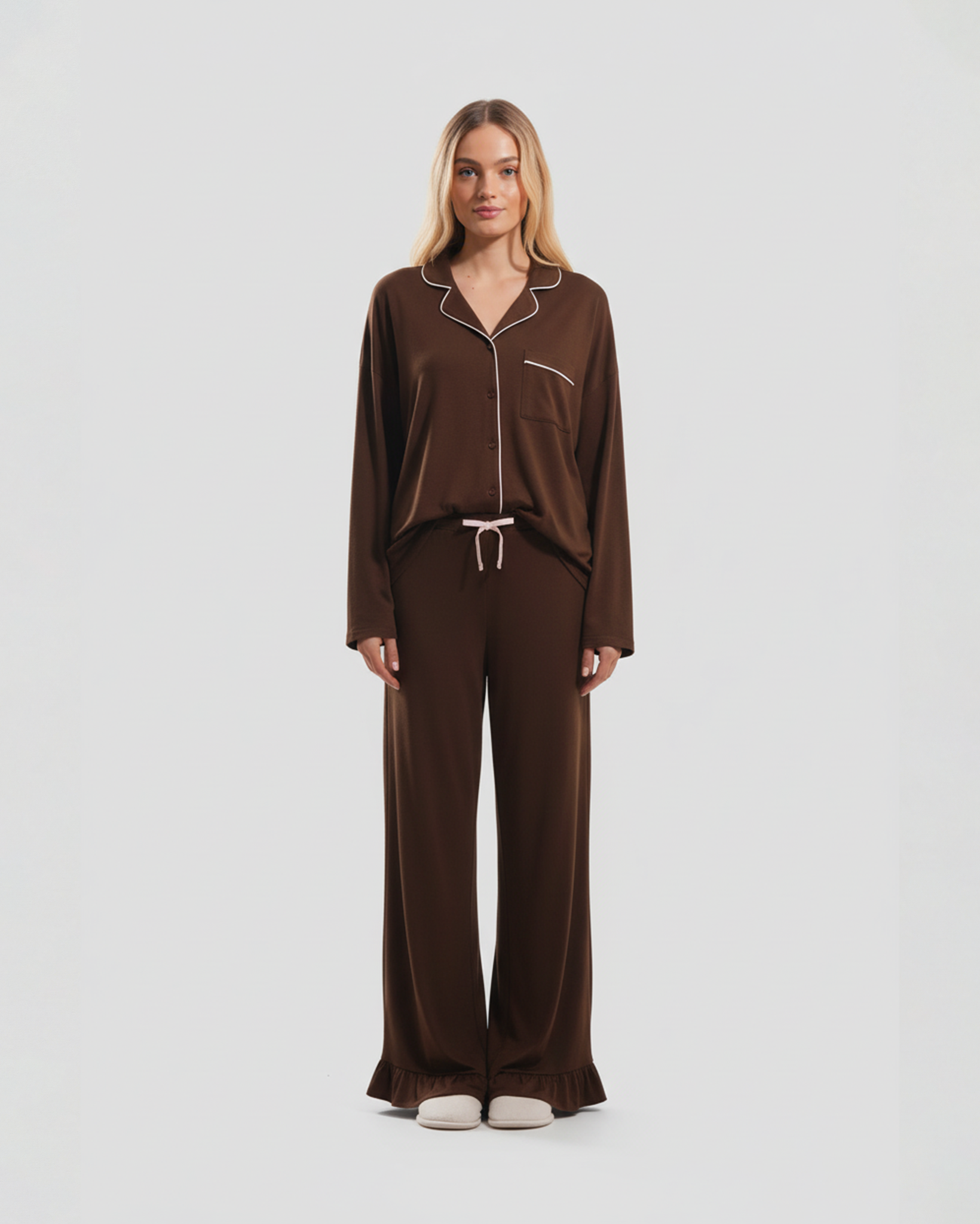 %95 Lyocell, %5 Elastan kumaştan üretilen bu takım, hafif ve nefes alan yapısıyla gün boyu konfor sunar. Pembe biyeli üst formu ve fırfır bitişli bol paça pantolonu, rahatlığı zarif detaylarla dengeler.
