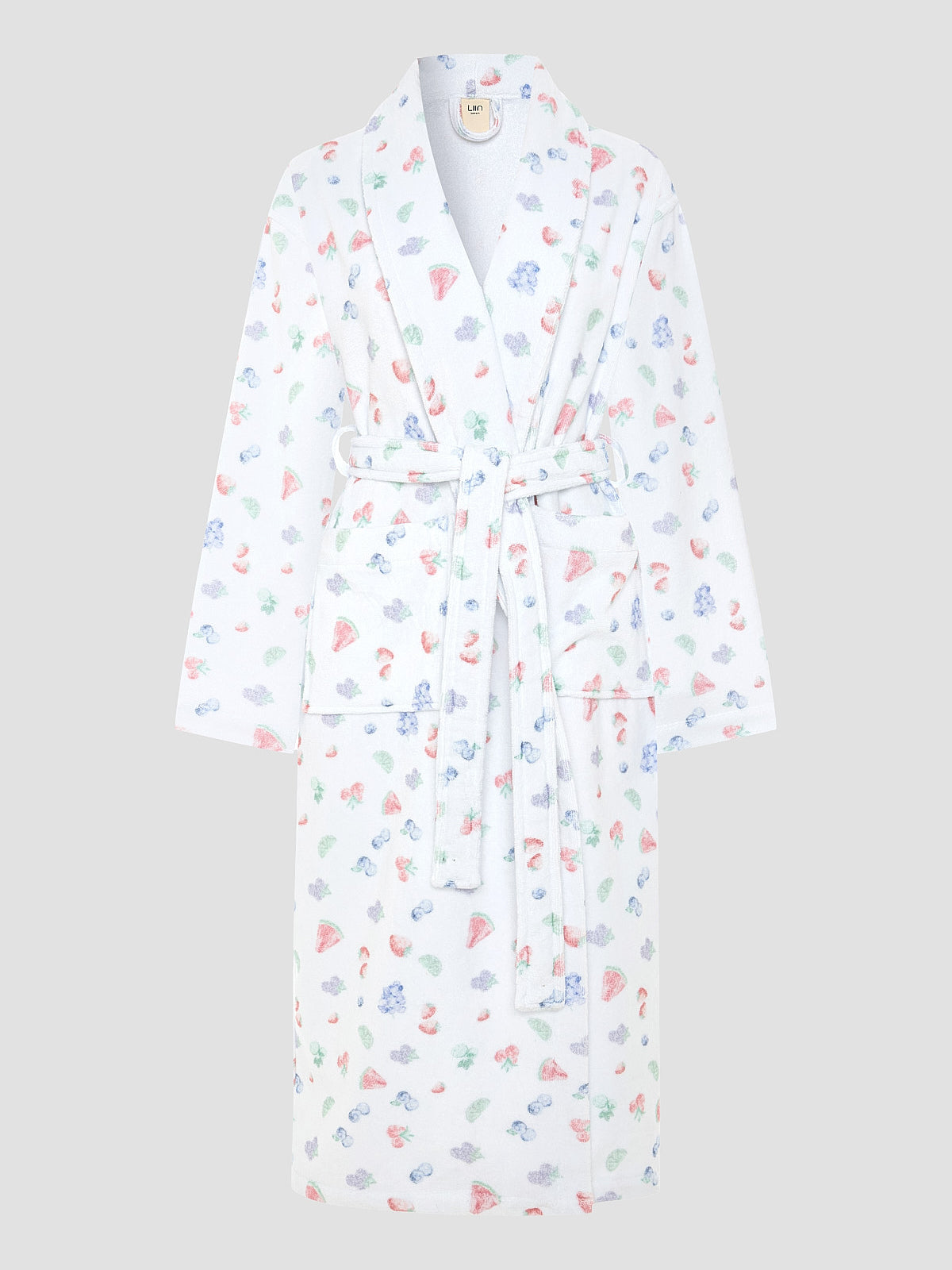 Hem sabahlık hem bornoz olarak değiştirmek pratik bir parça. Renkli meyve desenleri banyolarından sonra ferahlık ve canlılık hissi verir. Yumuşak dokusuyla günün her anına ait olur.